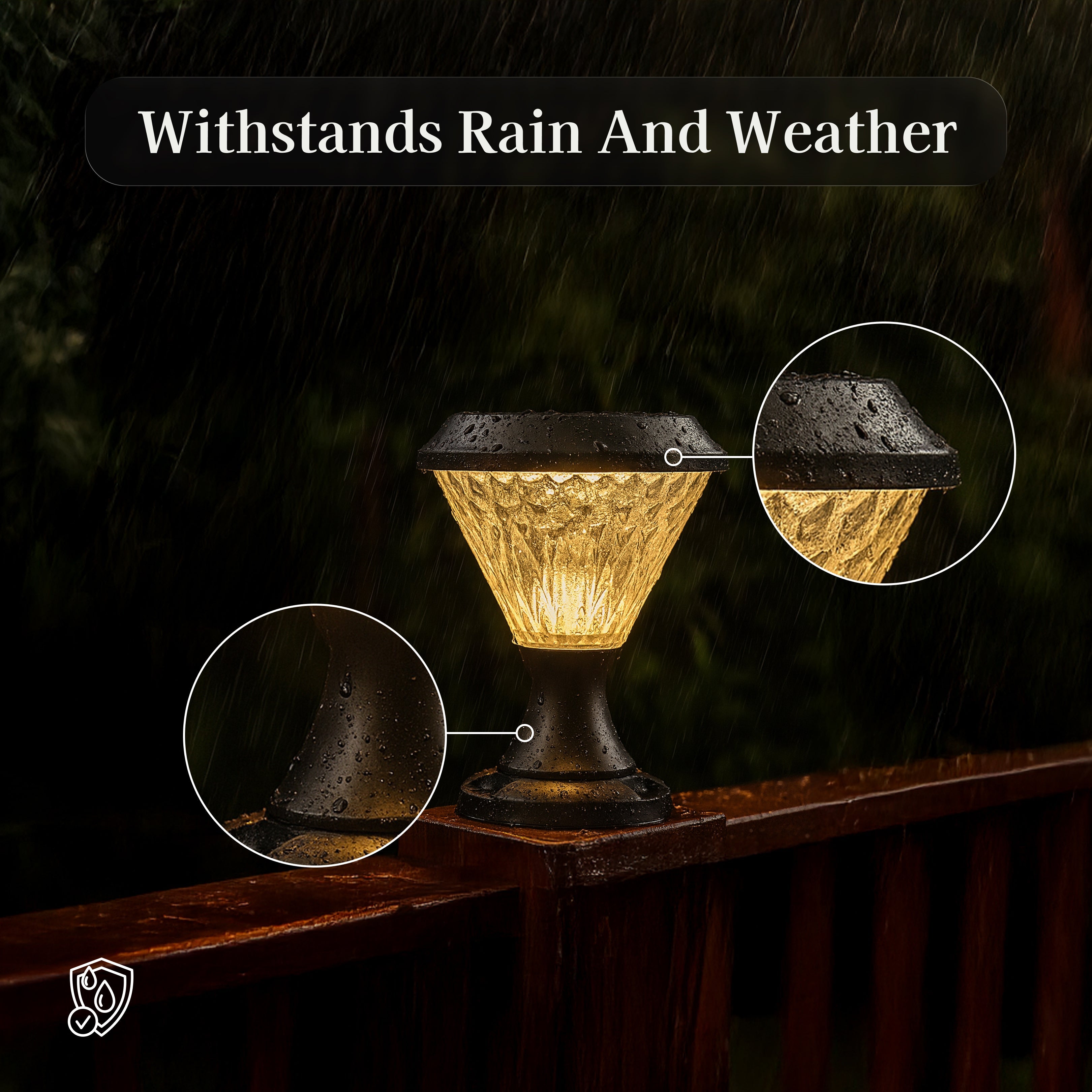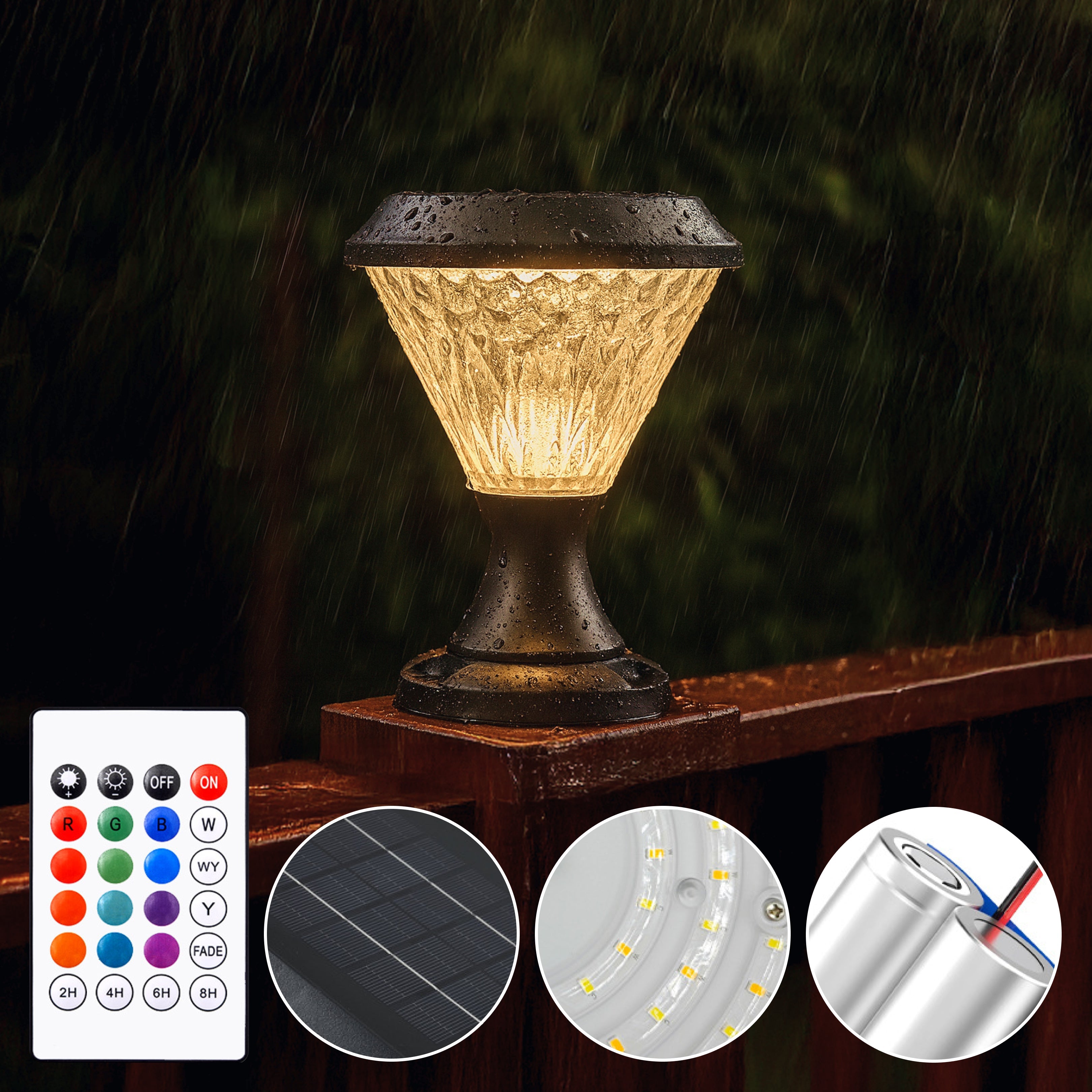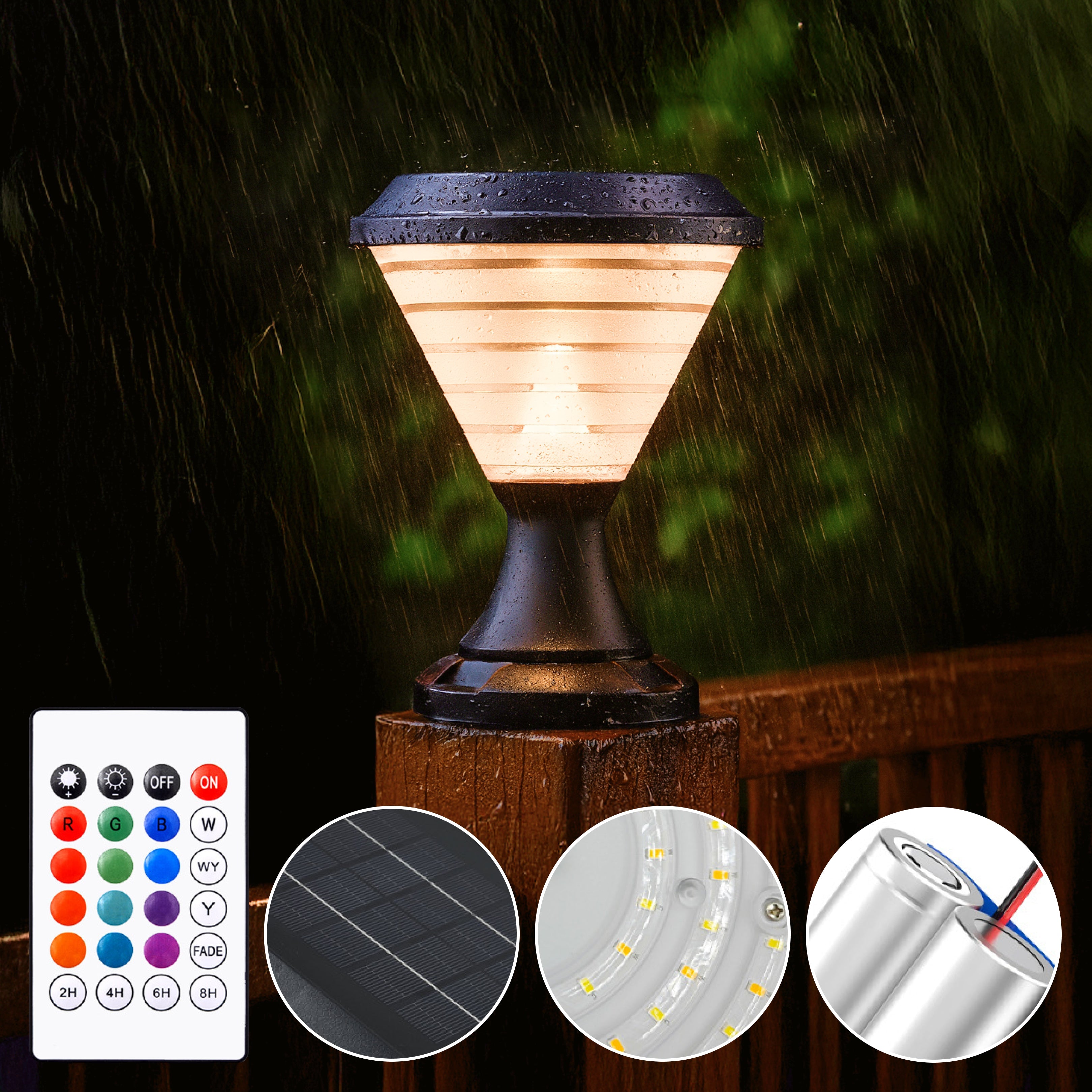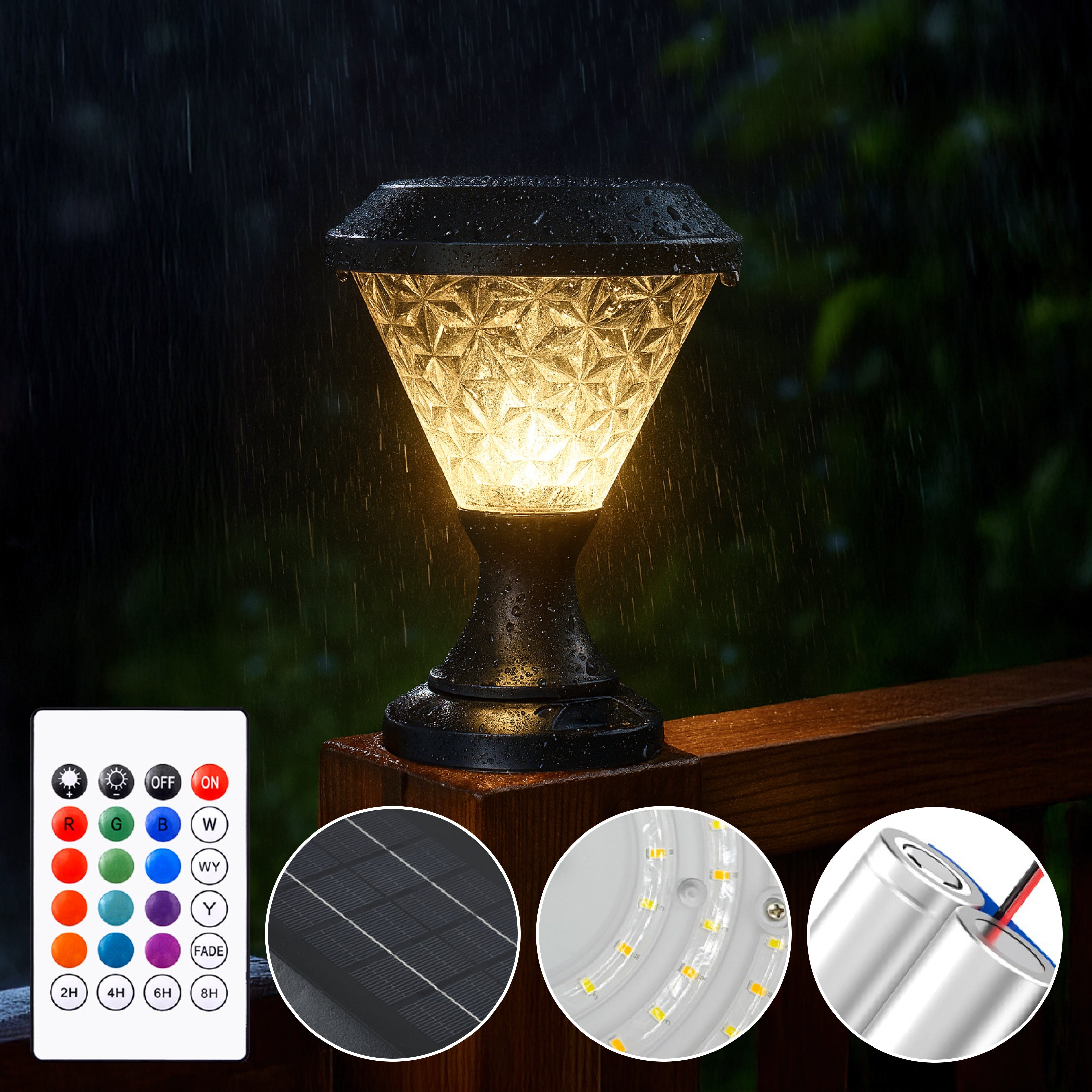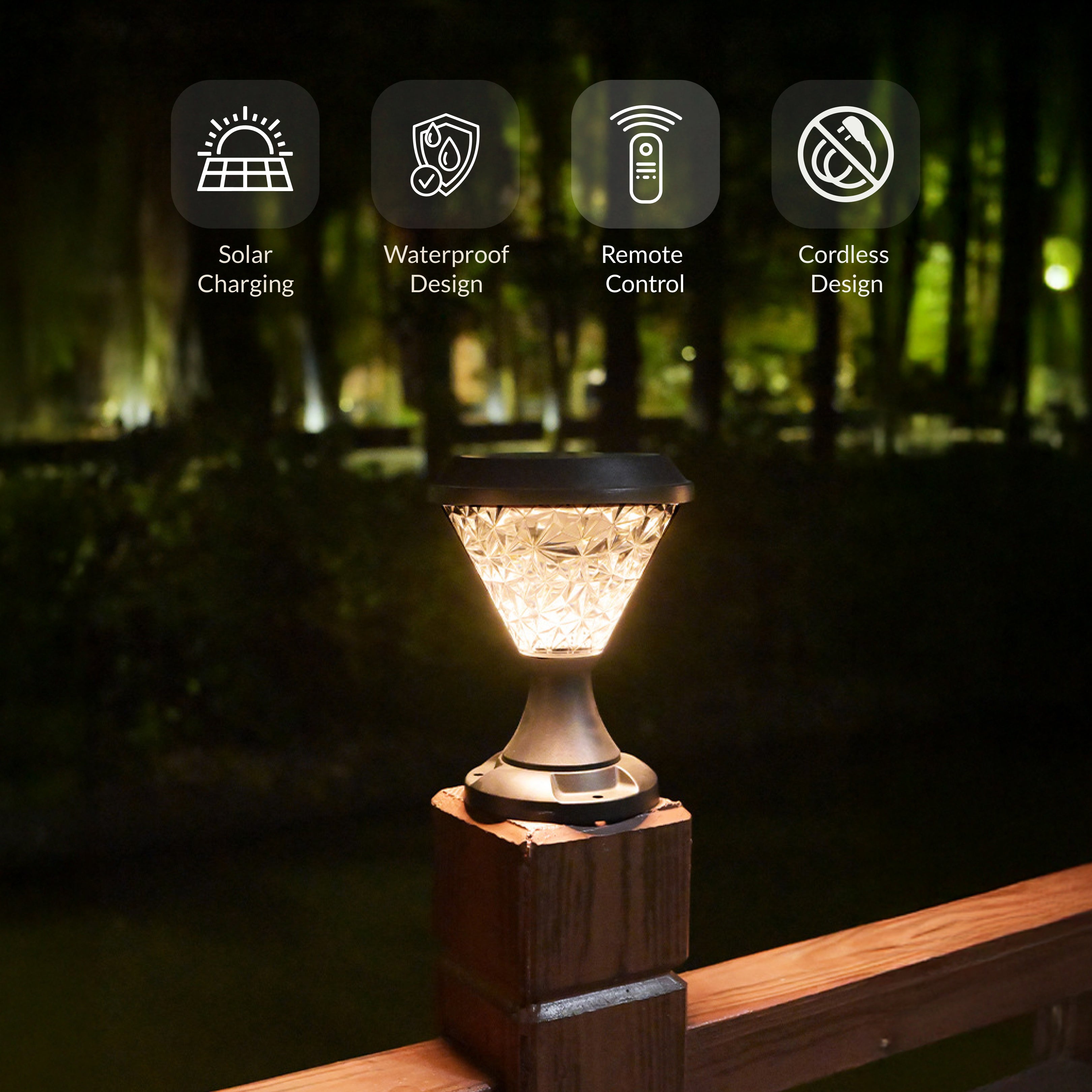 Facet Solar Powered Post Light from Weslen Home features solar powered operation, remote control functionality, and waterproof protection. This post light is designed for outdoor use, making it suitable for decks, patios, and fence posts where convenient, wire-free lighting is needed. Its durable waterproof construction ensures reliable performance in various weather conditions, while the included remote control offers easy operation and adjustment.