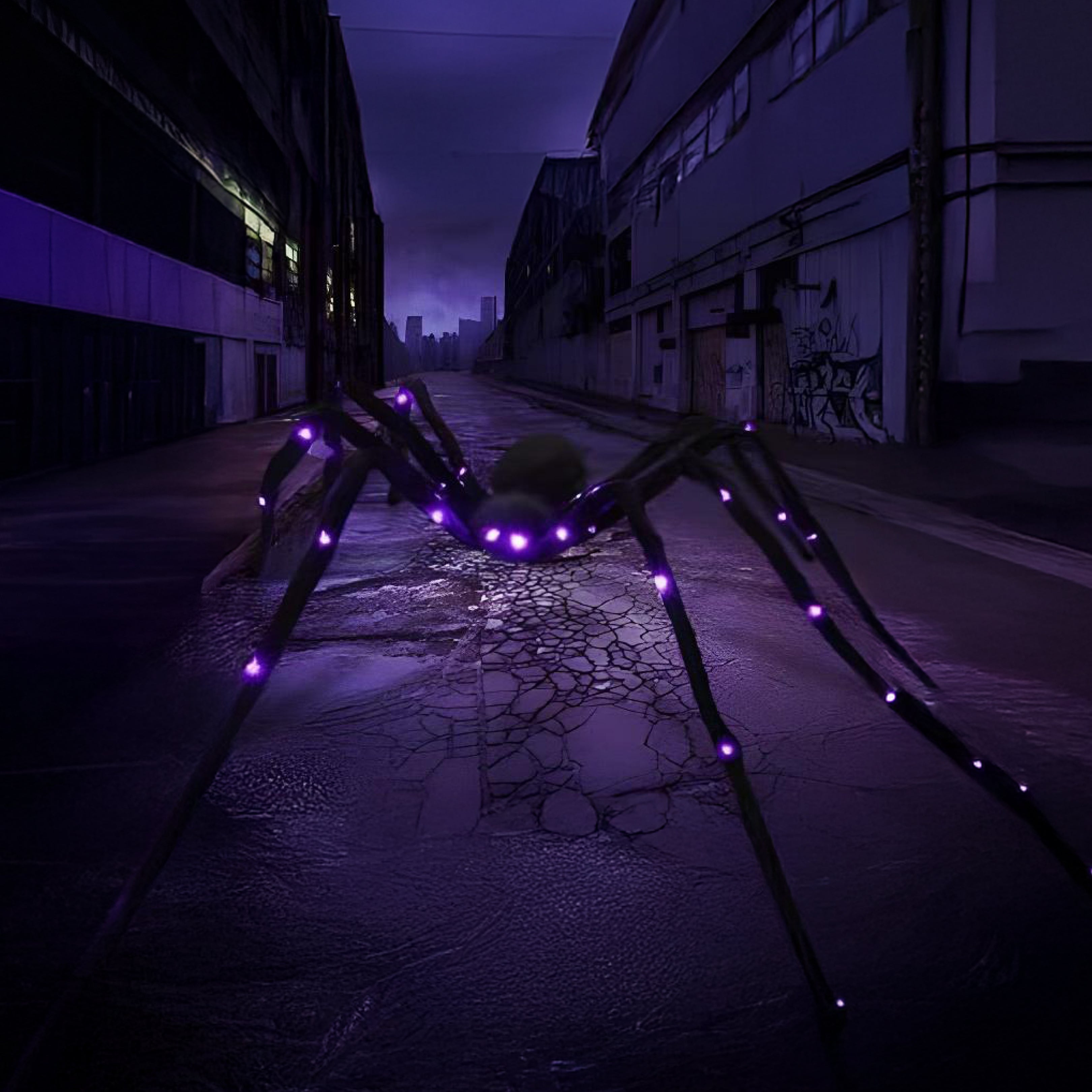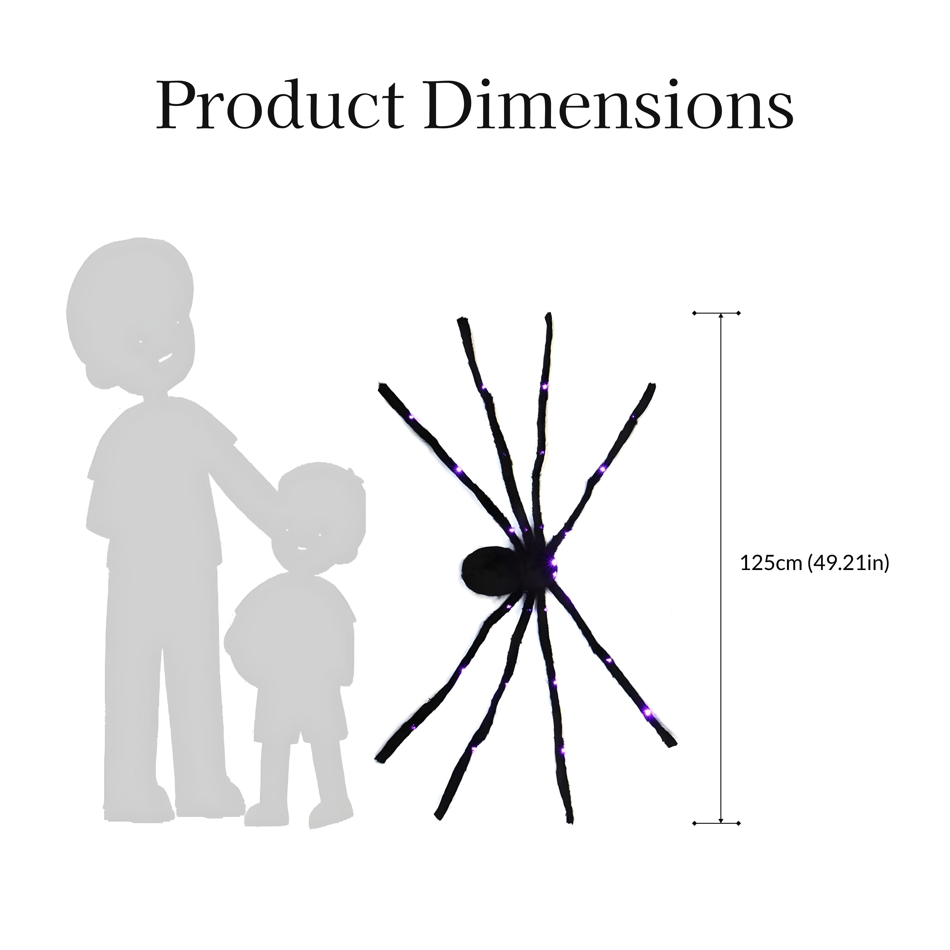 Make your Halloween setup unforgettable with this giant light-up spider decoration. Measuring over 4 feet (49 inches) across, it features realistic black fur, bendable legs, and glowing purple LED lights that bring it to life at night. Powered by 3 AA batteries (not included), the spider is easy to set up indoors or outdoors using the built-in hanging rope. Whether placed on your lawn, rooftop, or walls, this oversized glowing spider creates a chilling effect perfect for trick-or-treaters, haunted houses, or spooky parties. Durable and reusable year after year, it’s the ultimate statement piece for Halloween décor.