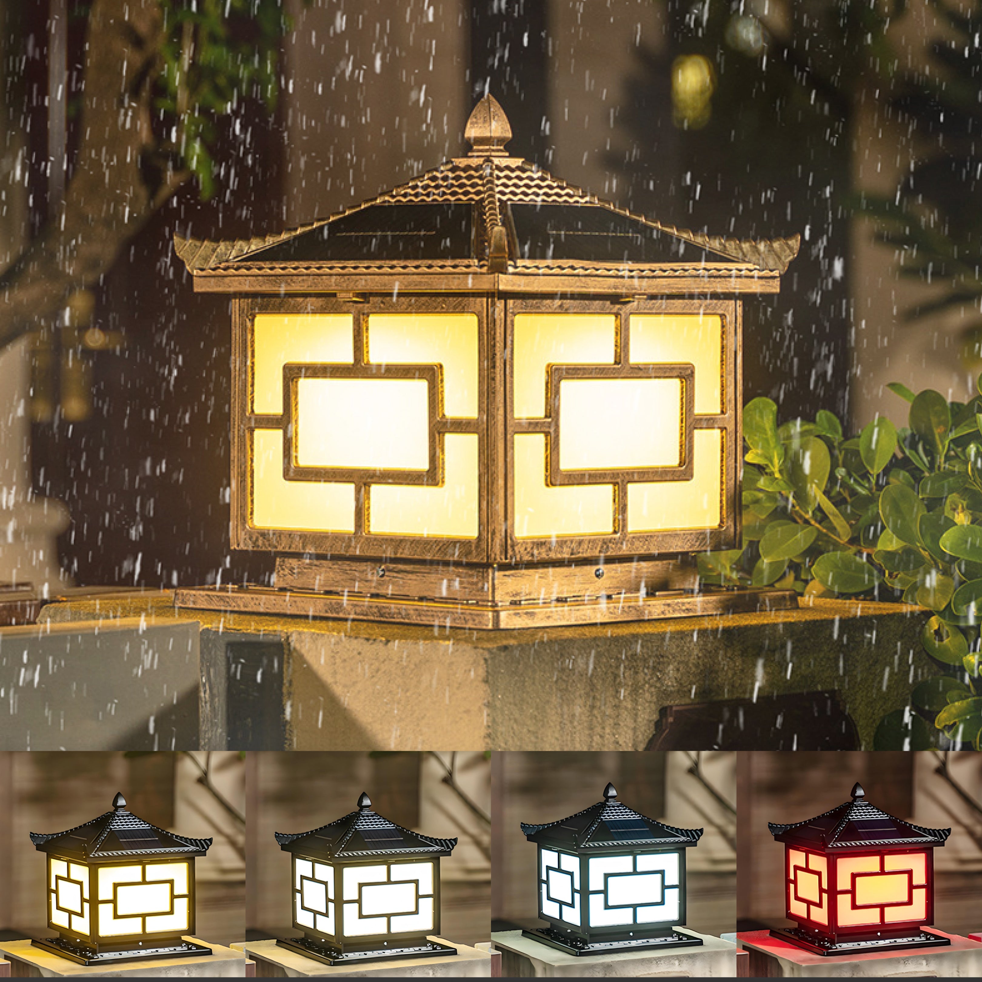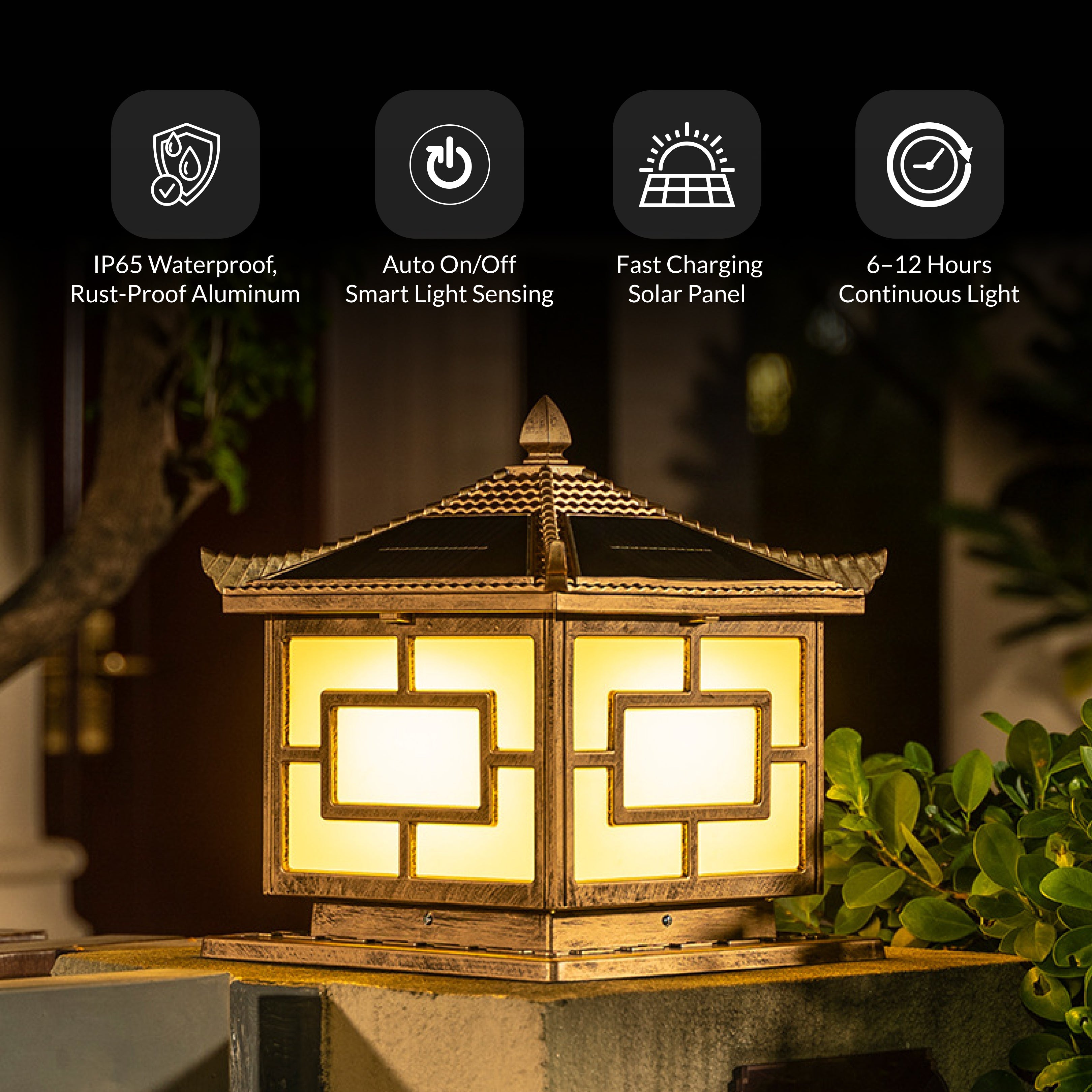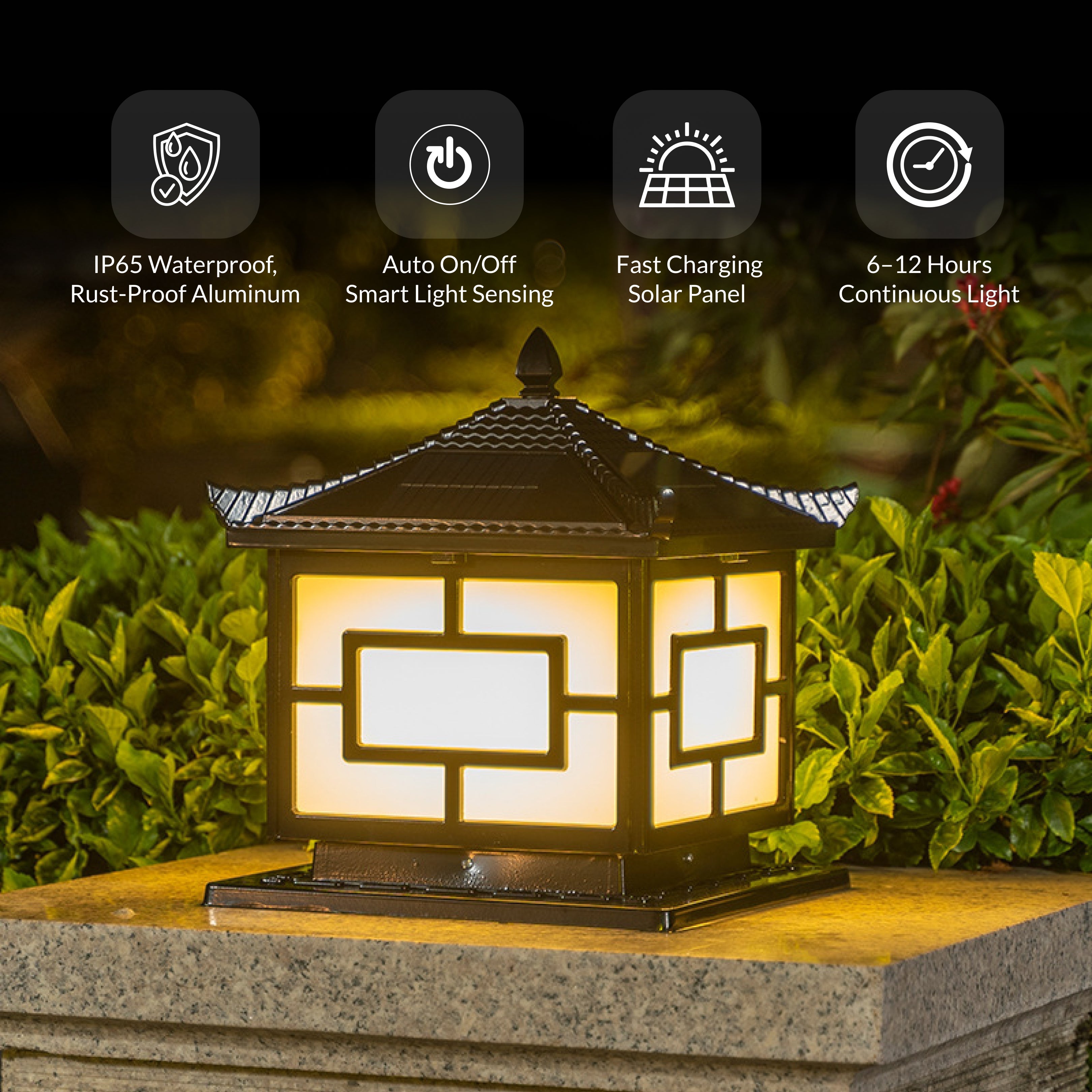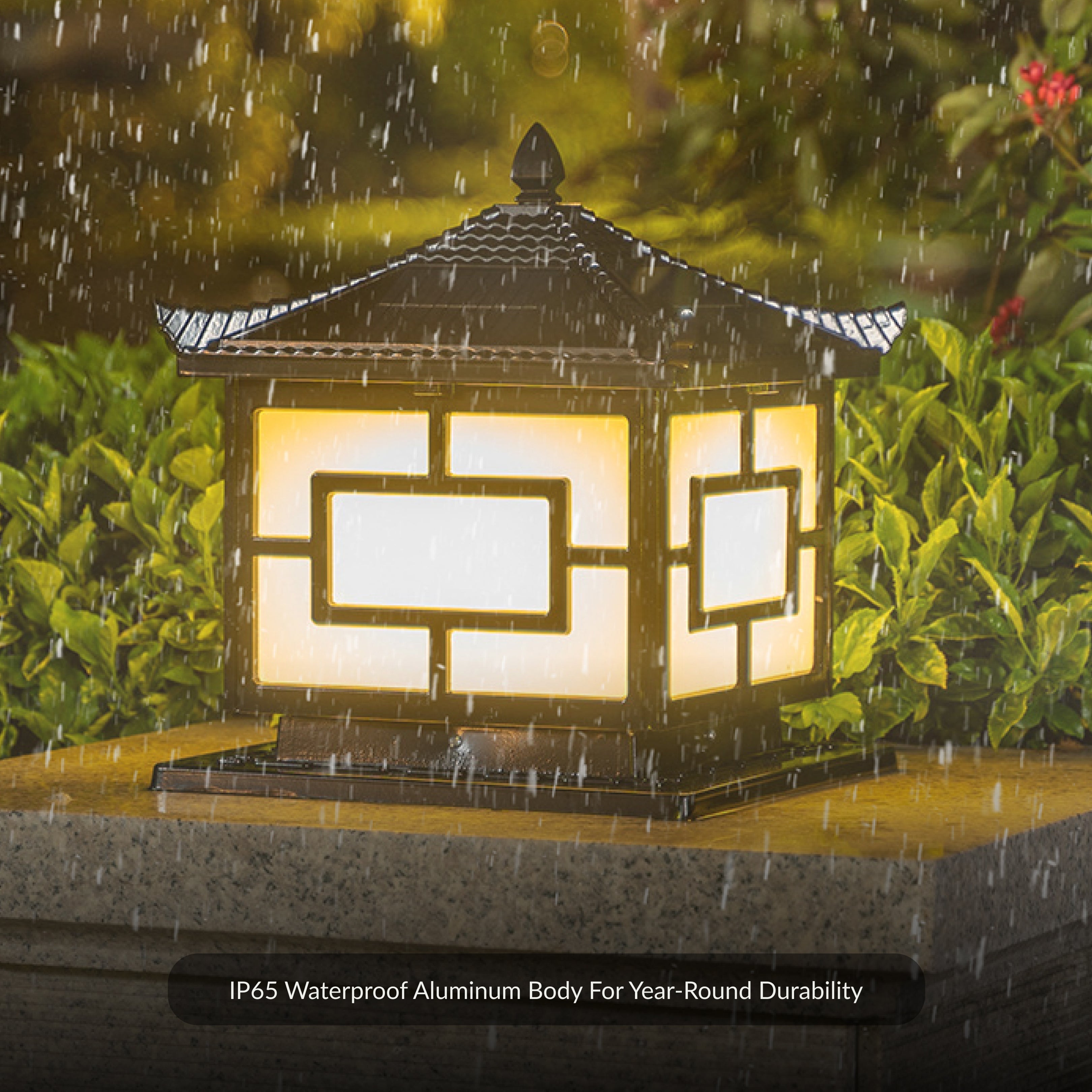 Pagoda Solar Powered Pillar Light from Weslen Home features solar powered operation with automatic lighting control and an IP65 waterproof rating. Designed as a post cap pillar light, it is suitable for outdoor placement on fences or in gardens, providing illumination without wiring or manual switches. The durable construction ensures reliable performance in various weather conditions.