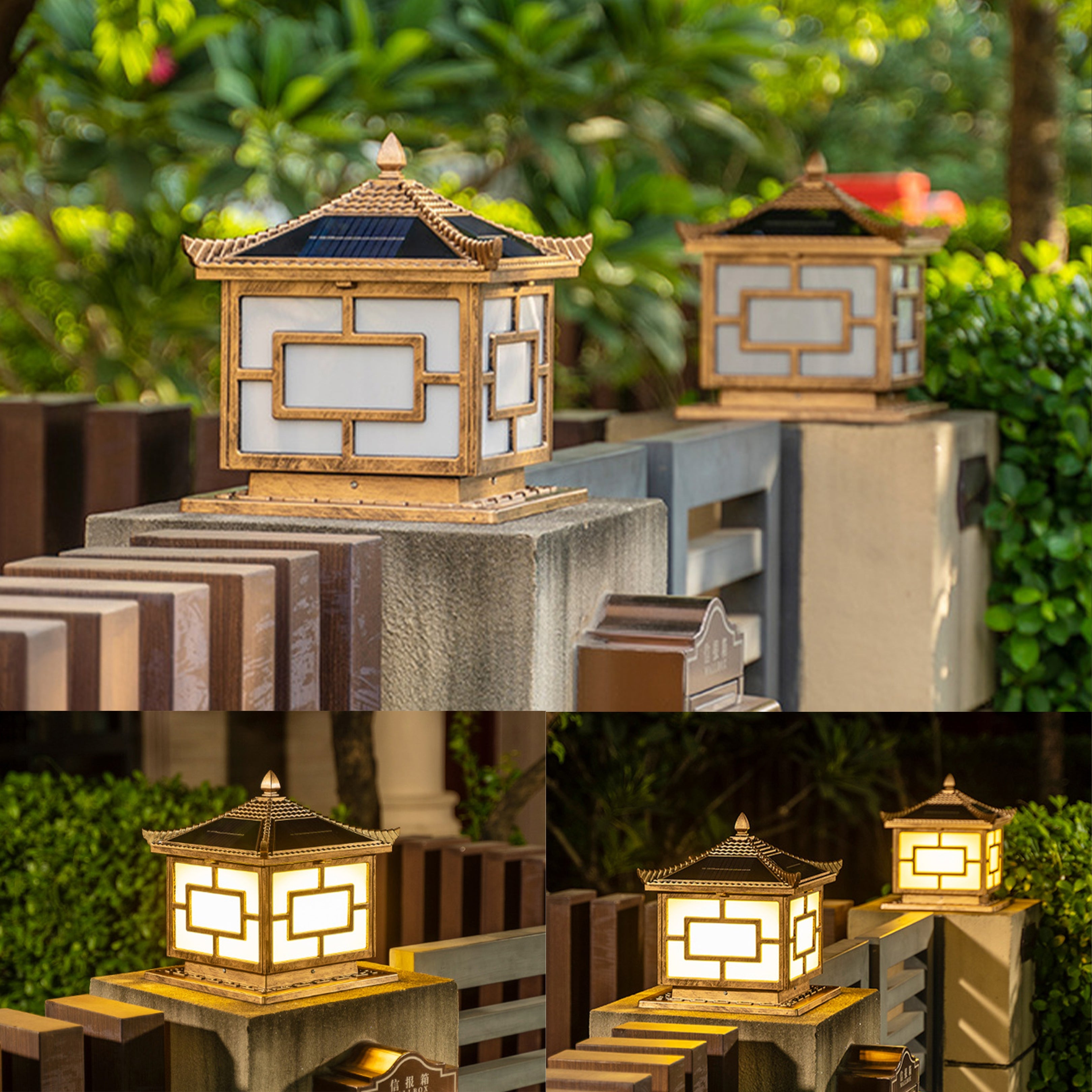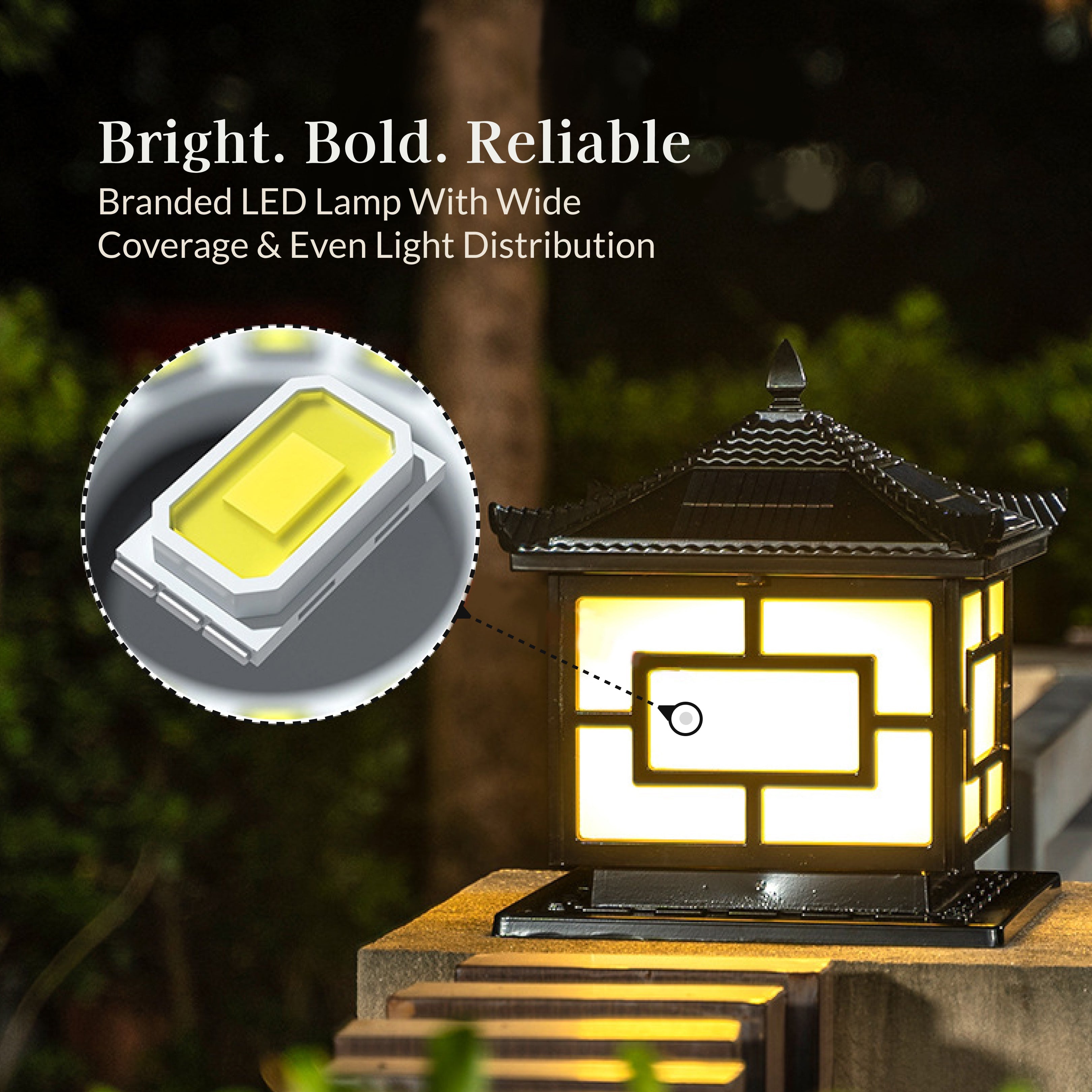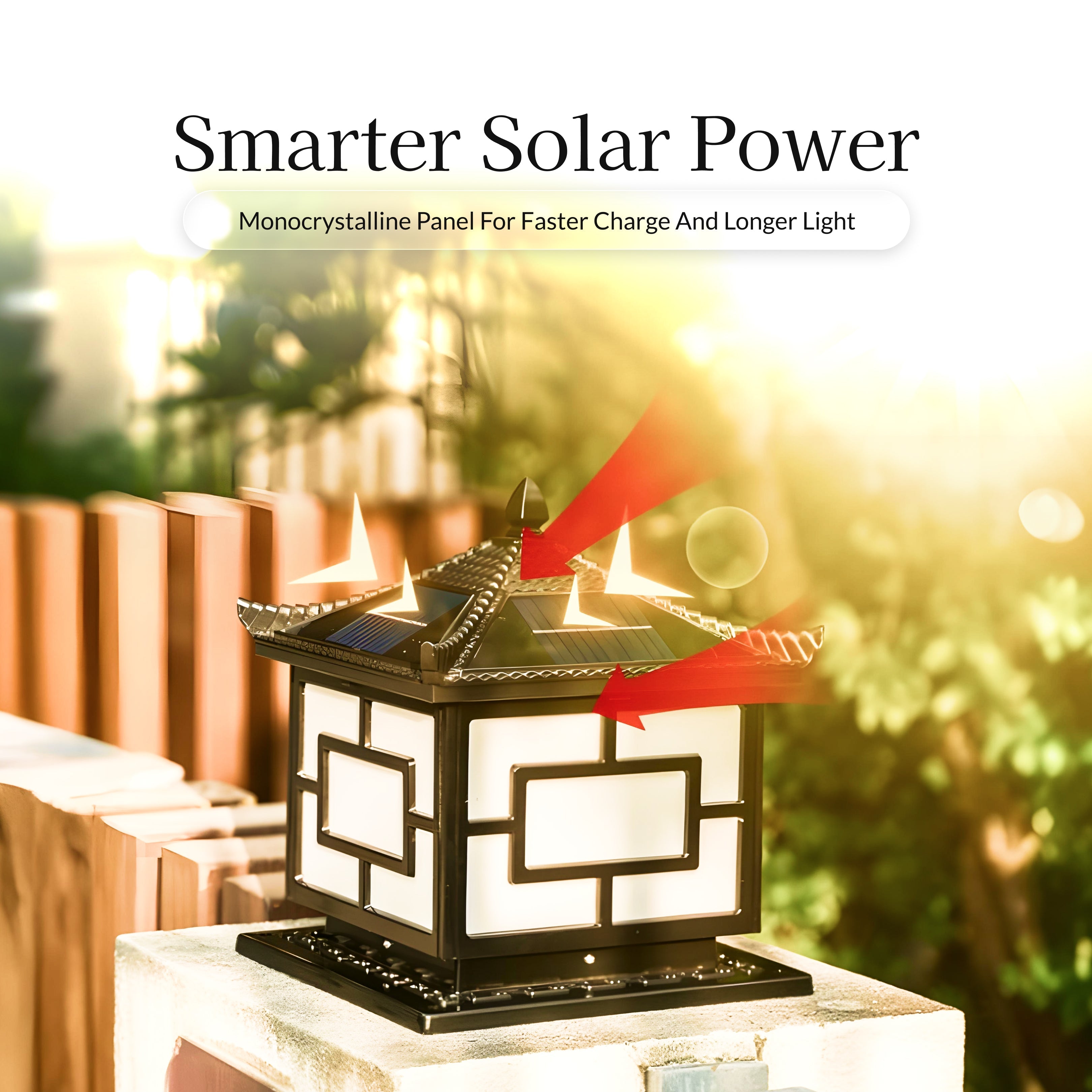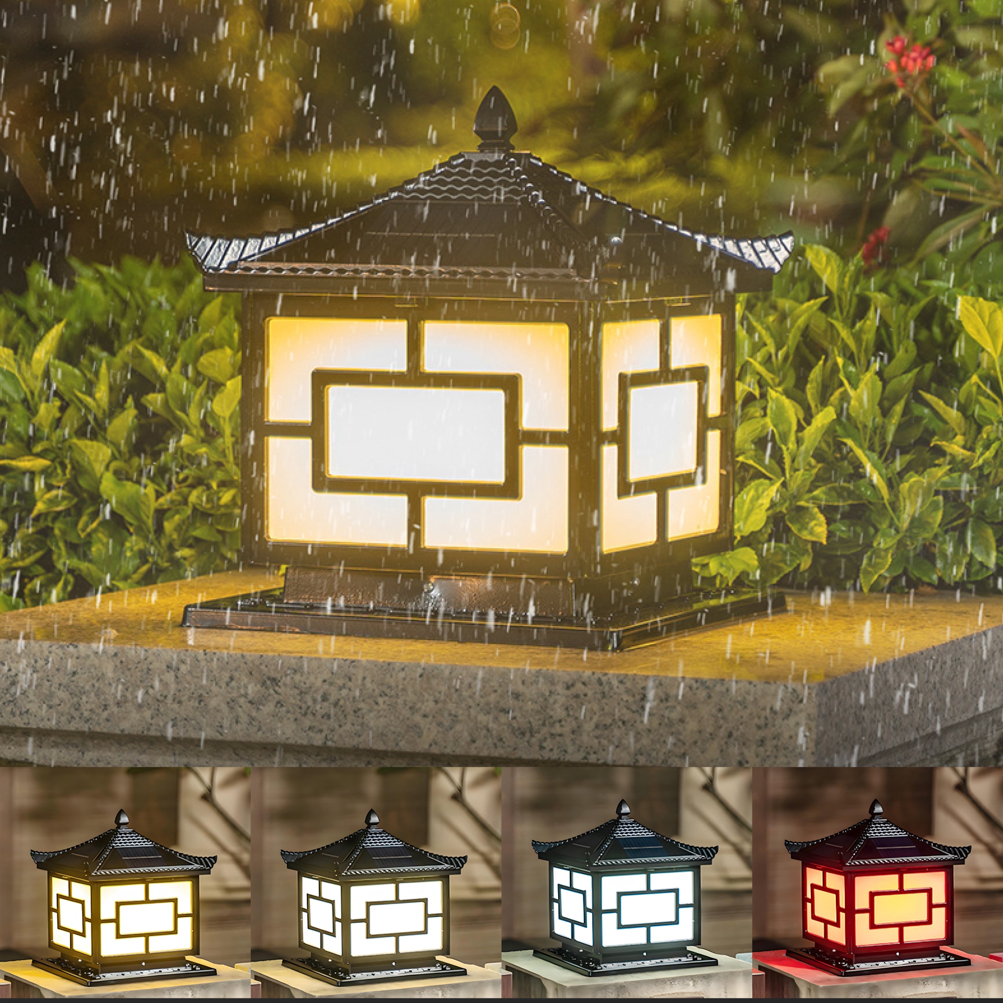 Pagoda Solar Powered Pillar Light from Weslen Home features solar powered operation with automatic lighting control and an IP65 waterproof rating. Designed as a post cap pillar light, it is suitable for outdoor placement on fences or in gardens, providing illumination without wiring or manual switches. The durable construction ensures reliable performance in various weather conditions.