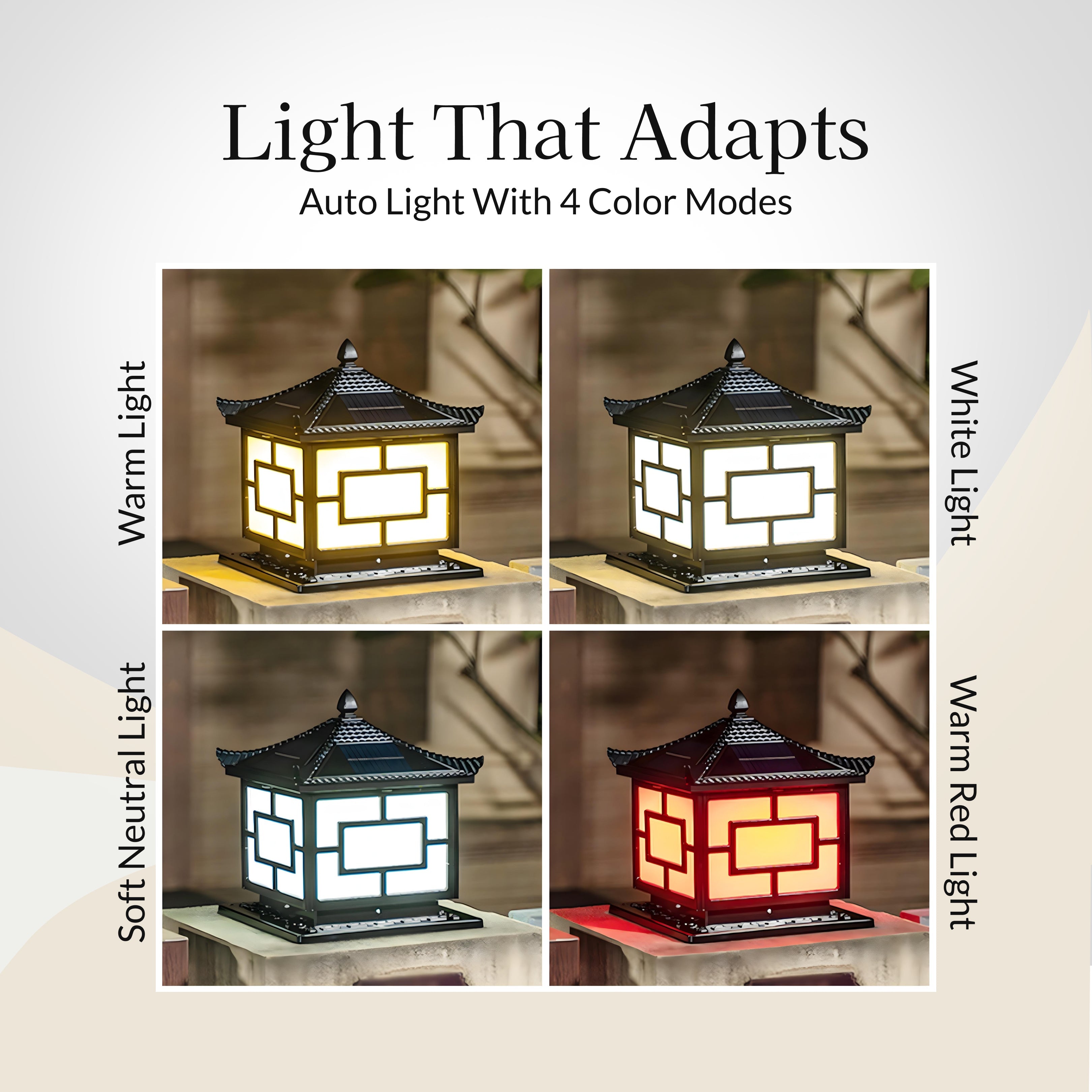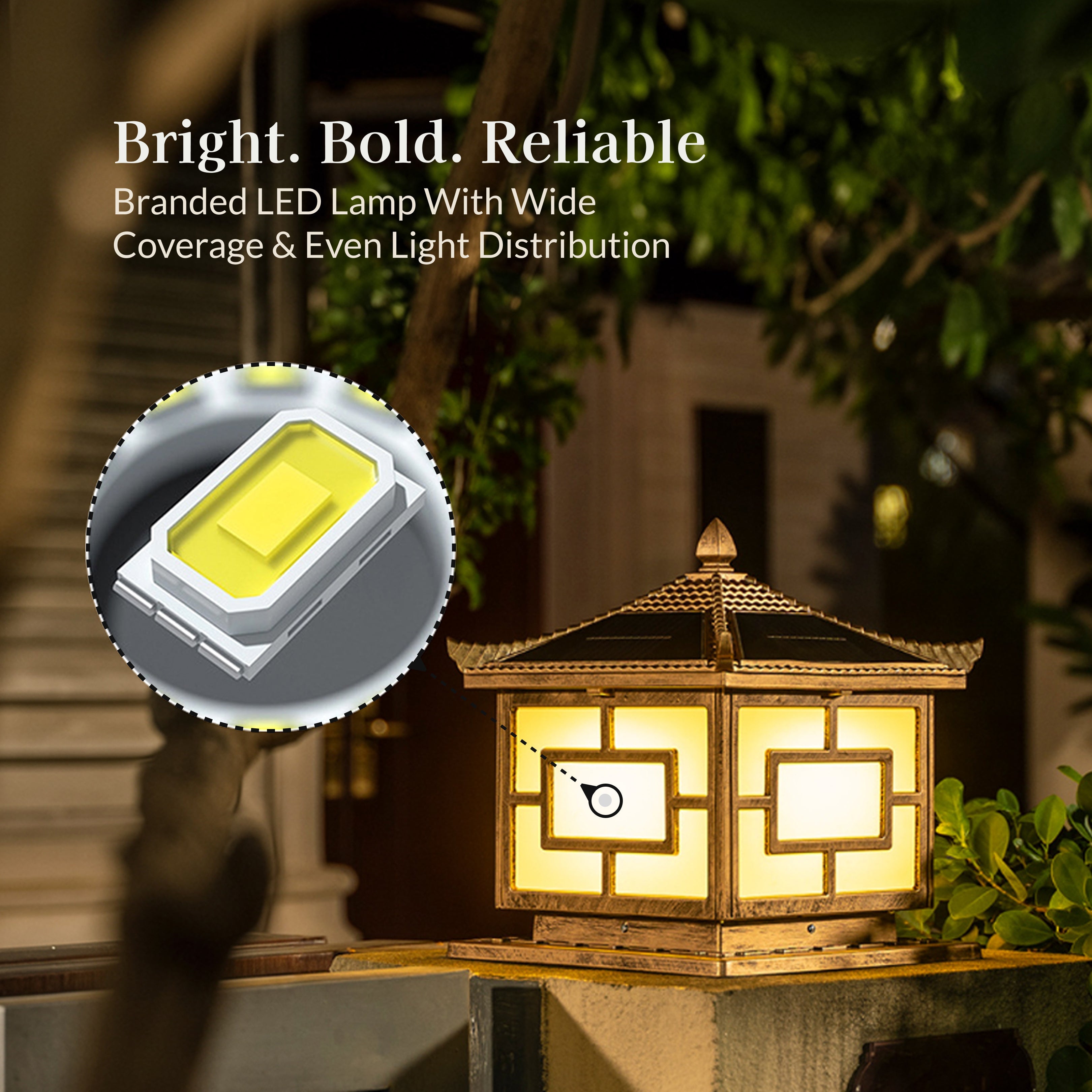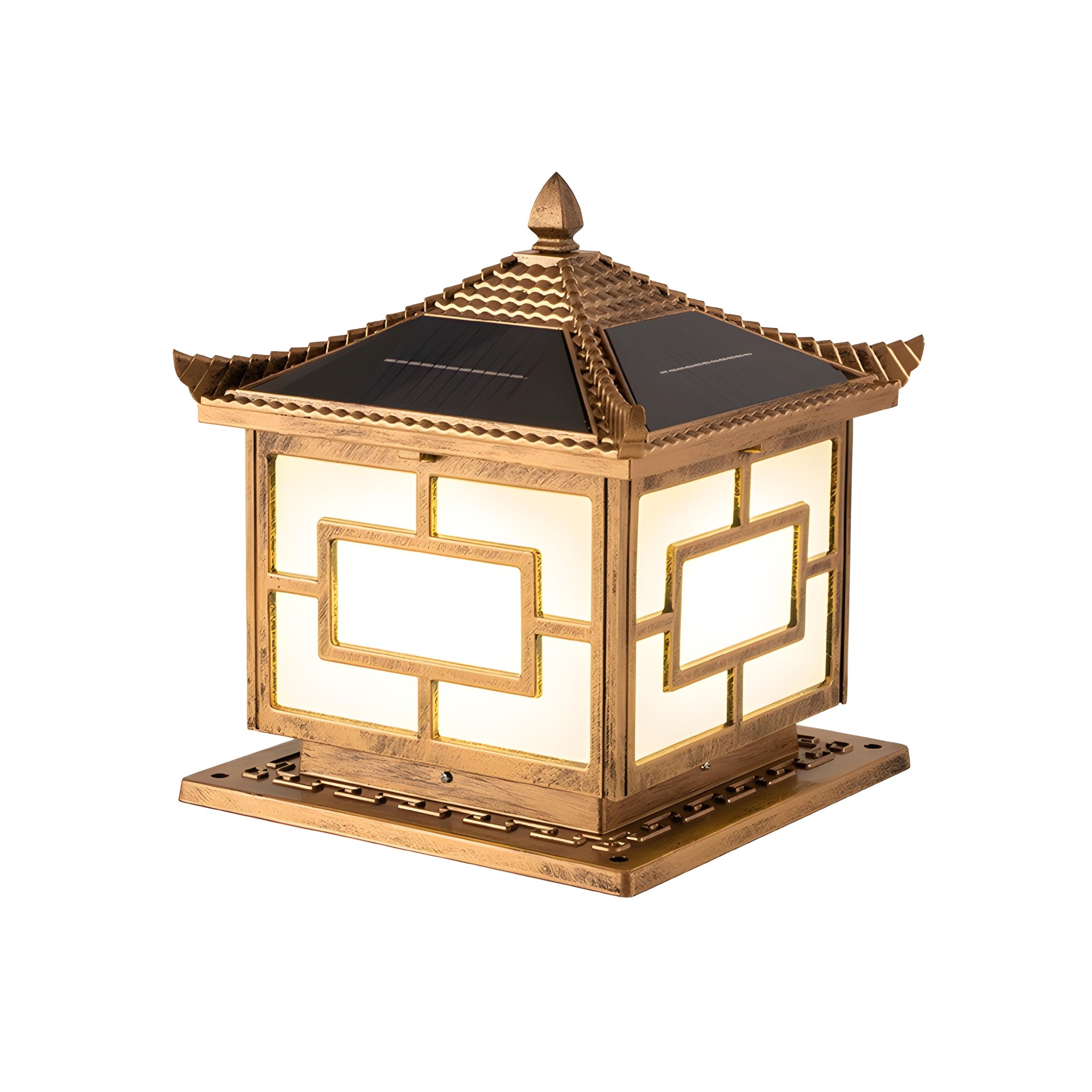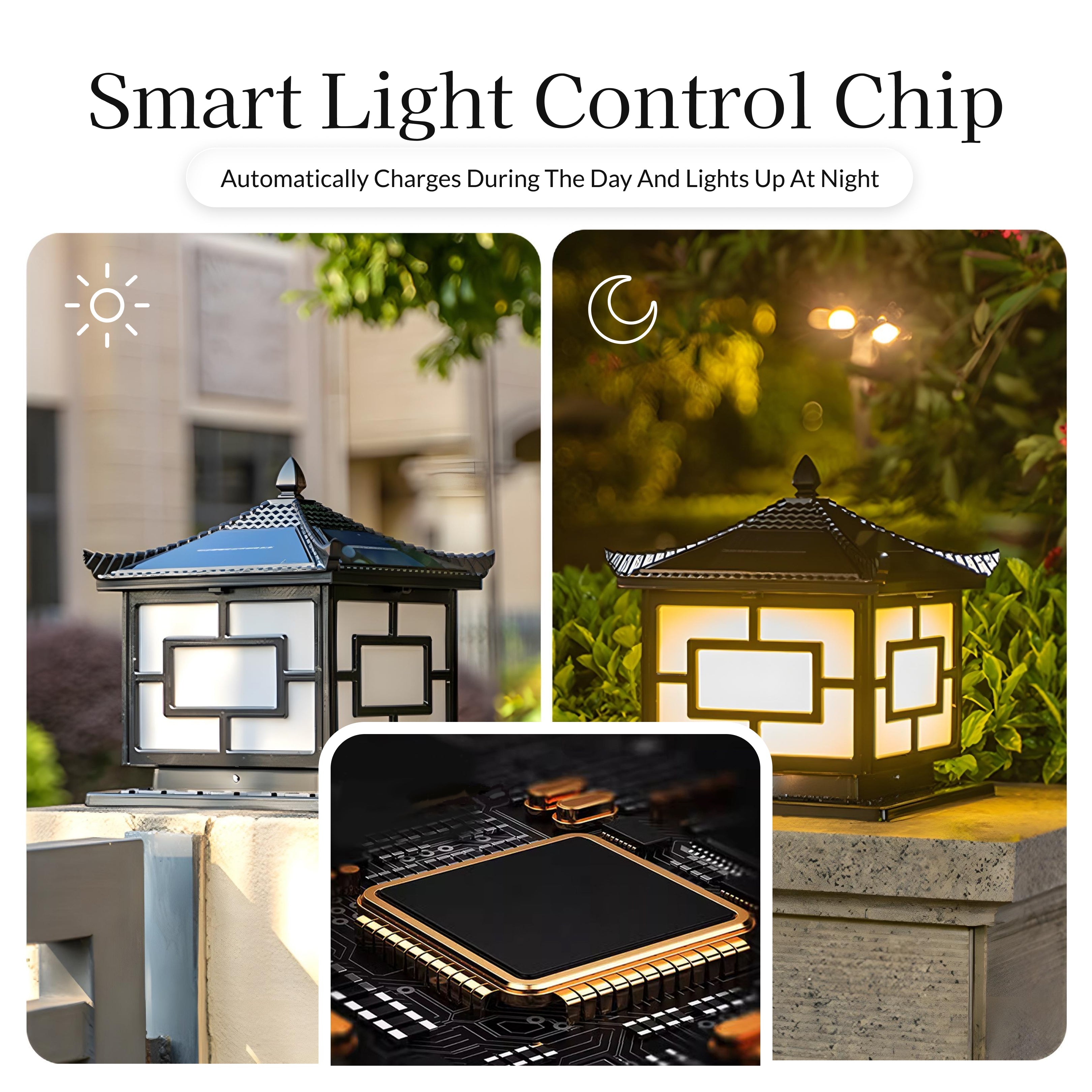 Pagoda Solar Powered Pillar Light from Weslen Home features solar powered operation with automatic lighting control and an IP65 waterproof rating. Designed as a post cap pillar light, it is suitable for outdoor placement on fences or in gardens, providing illumination without wiring or manual switches. The durable construction ensures reliable performance in various weather conditions.