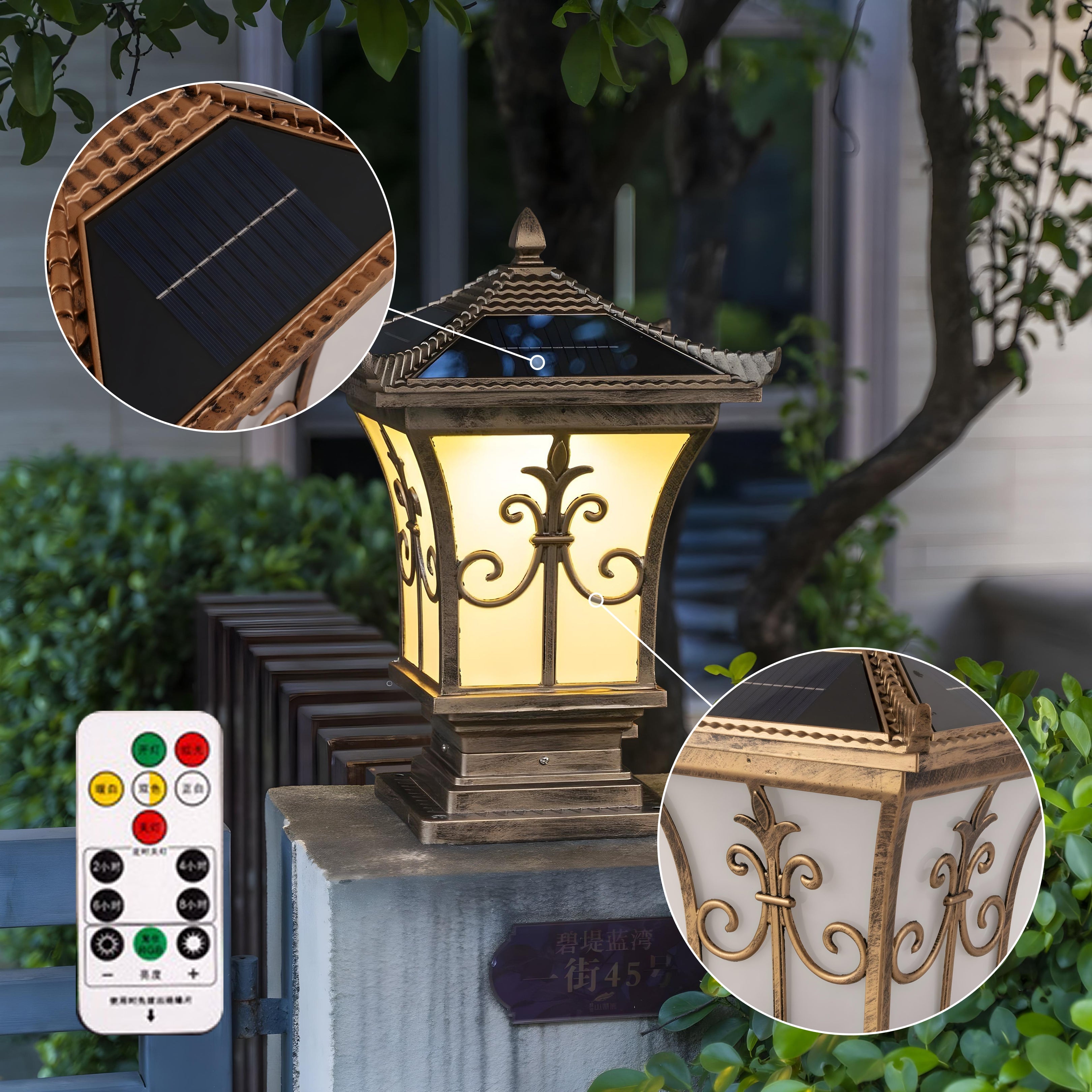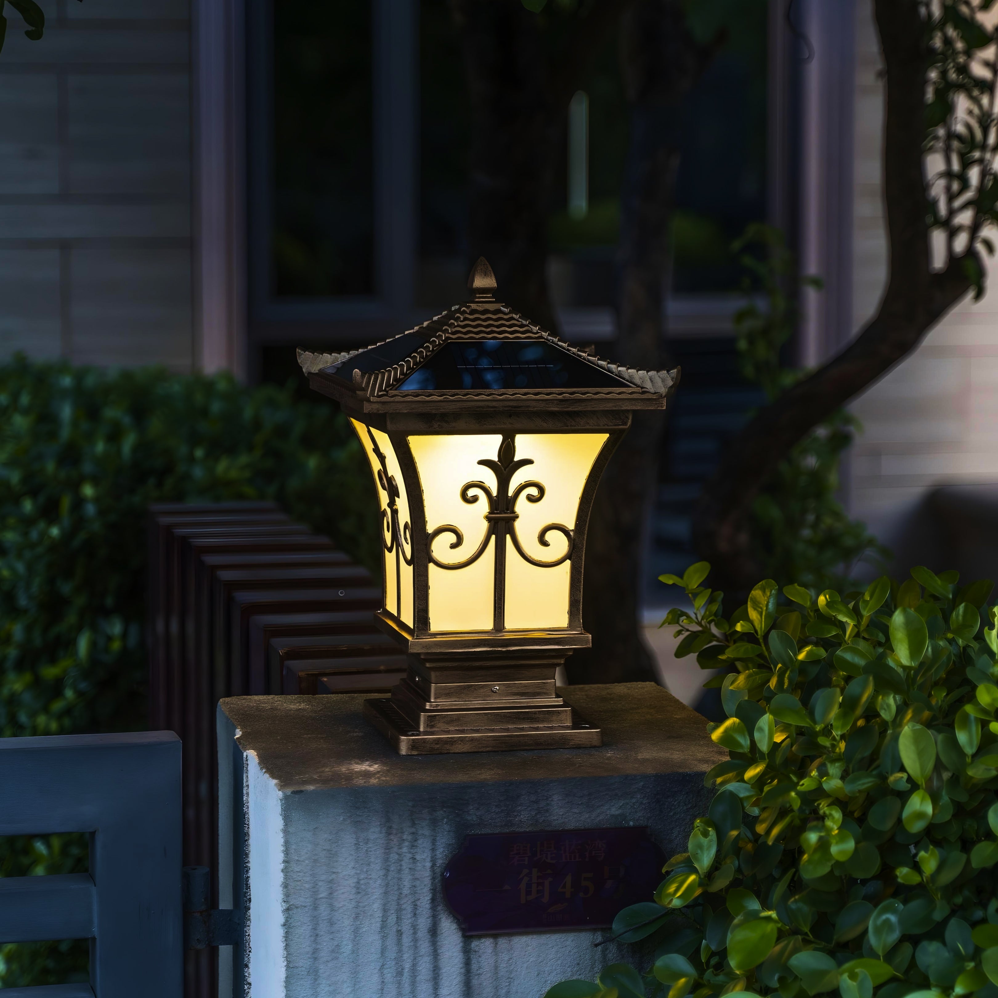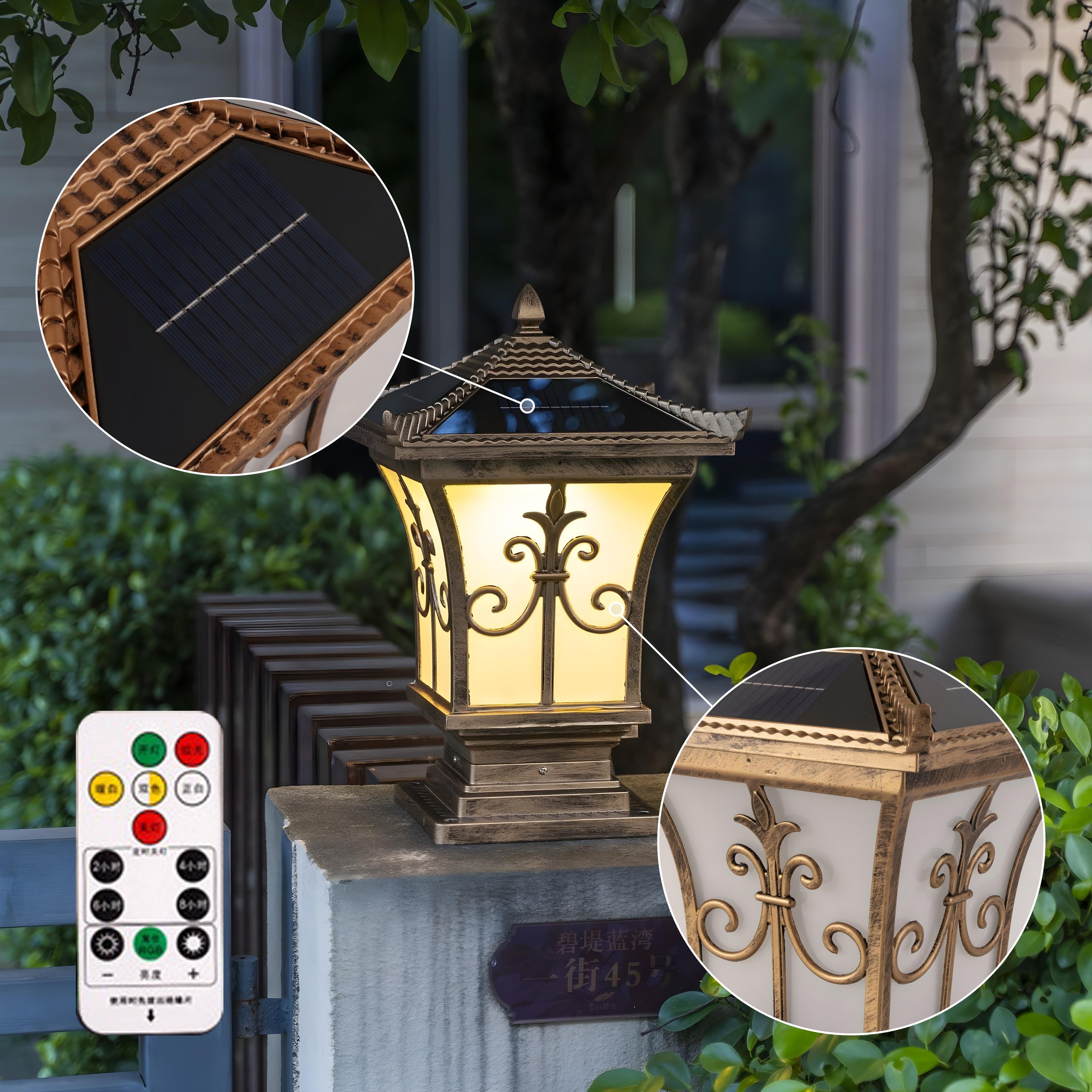 Pagoda Solar Powered Post Cap Light from Weslen Home features solar powered operation and a waterproof design. Ideal for outdoor fence posts and pathway lighting, this post cap light comes with a remote control for easy adjustments. It installs securely to standard posts, delivering reliable illumination suitable for various weather conditions.