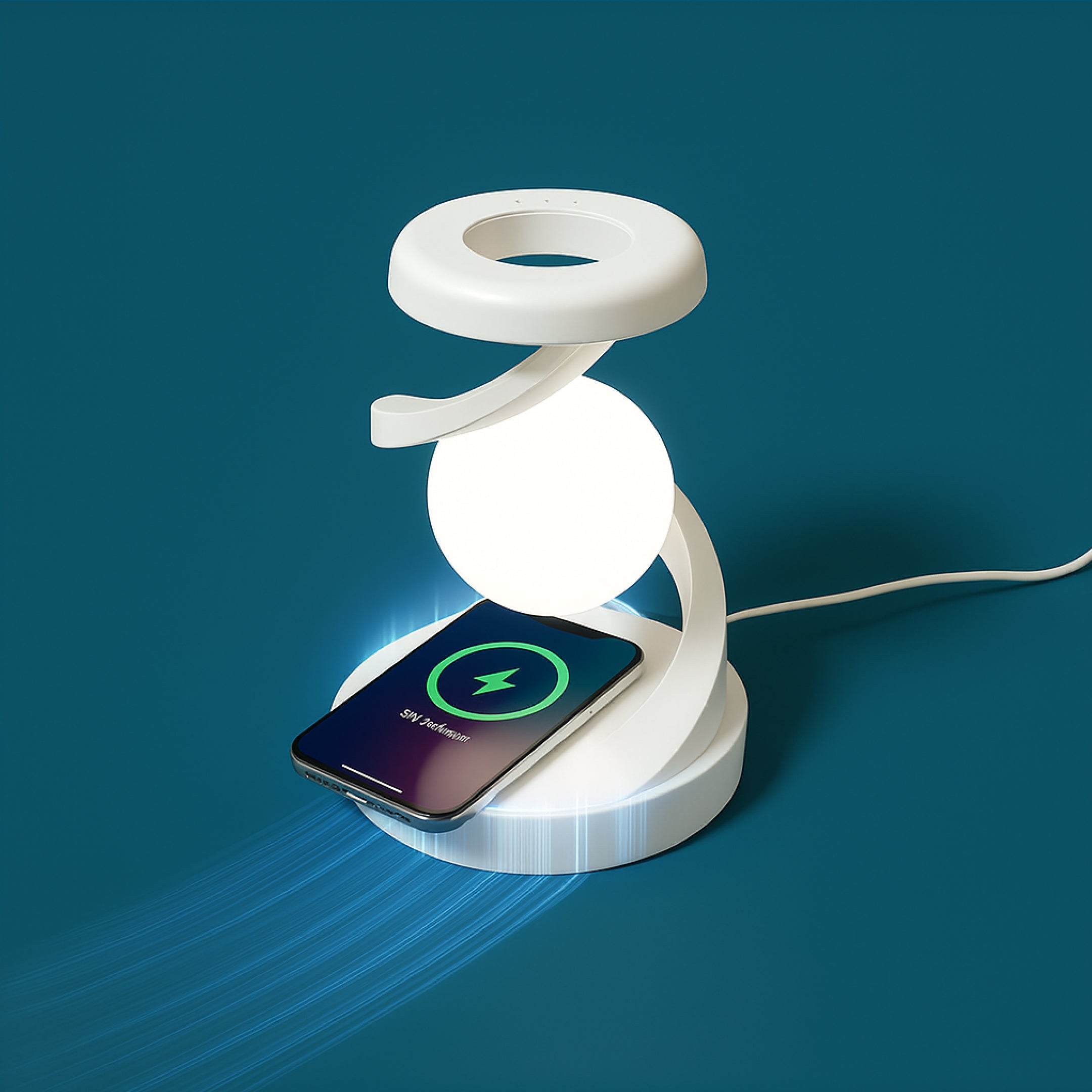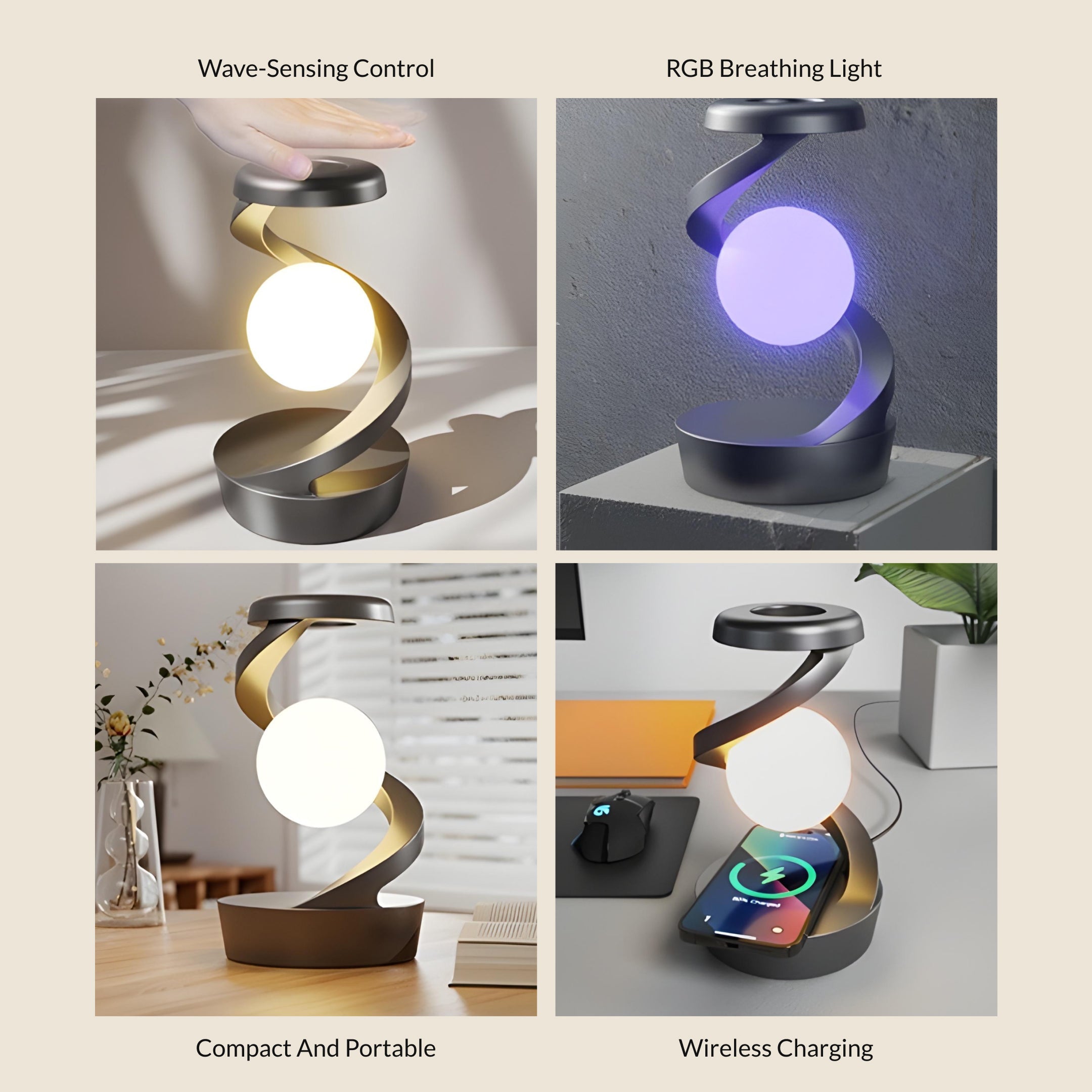 Spiral Wireless Charging Table Lamp from Weslen Home features built-in wireless charging, wave control operation, and adjustable RGB lighting. This table lamp is designed for indoor use in bedrooms or office and study spaces, providing convenient device charging alongside customizable light settings. Its user-friendly wave control allows quick on/off access, while the RGB lighting adapts to different tasks or moods.
