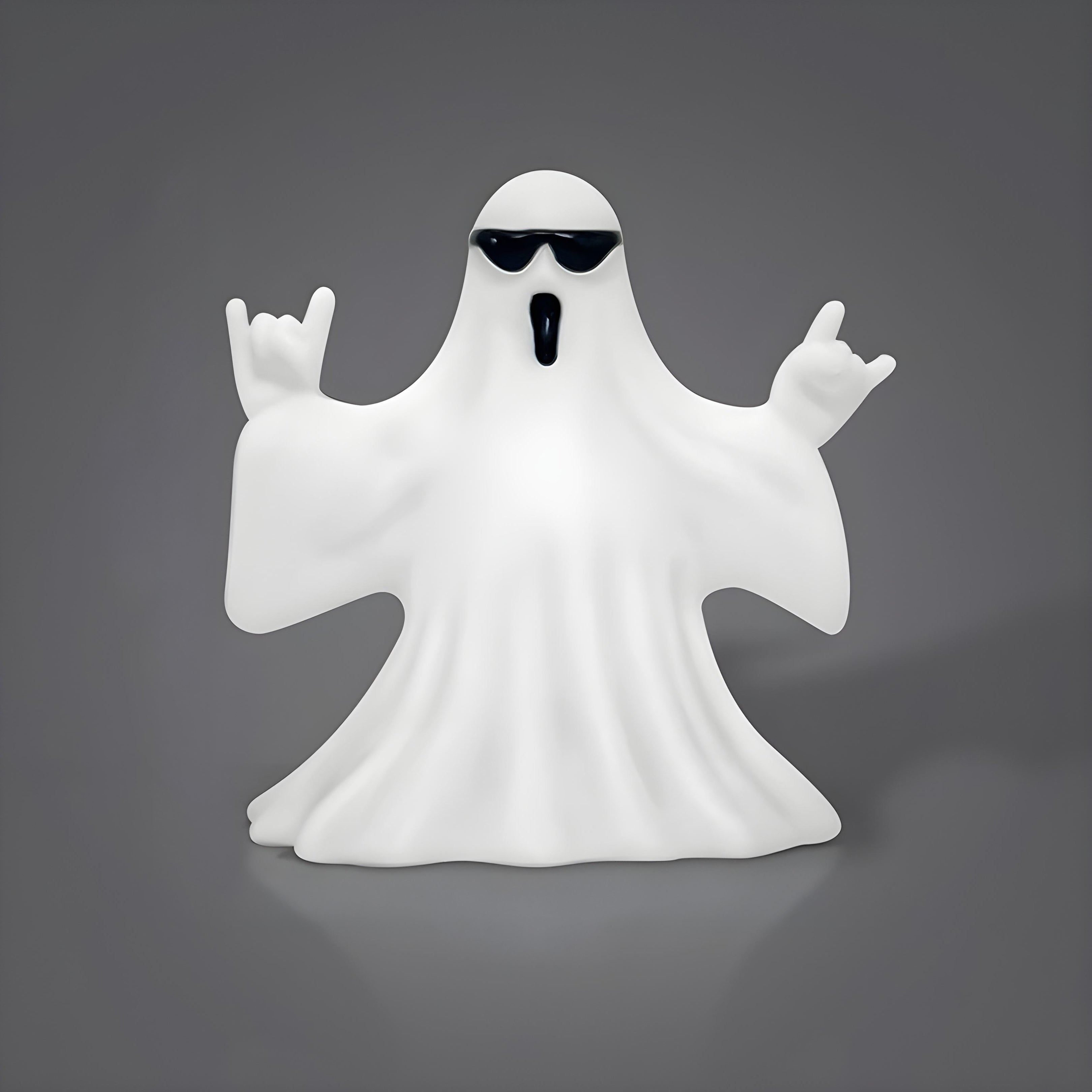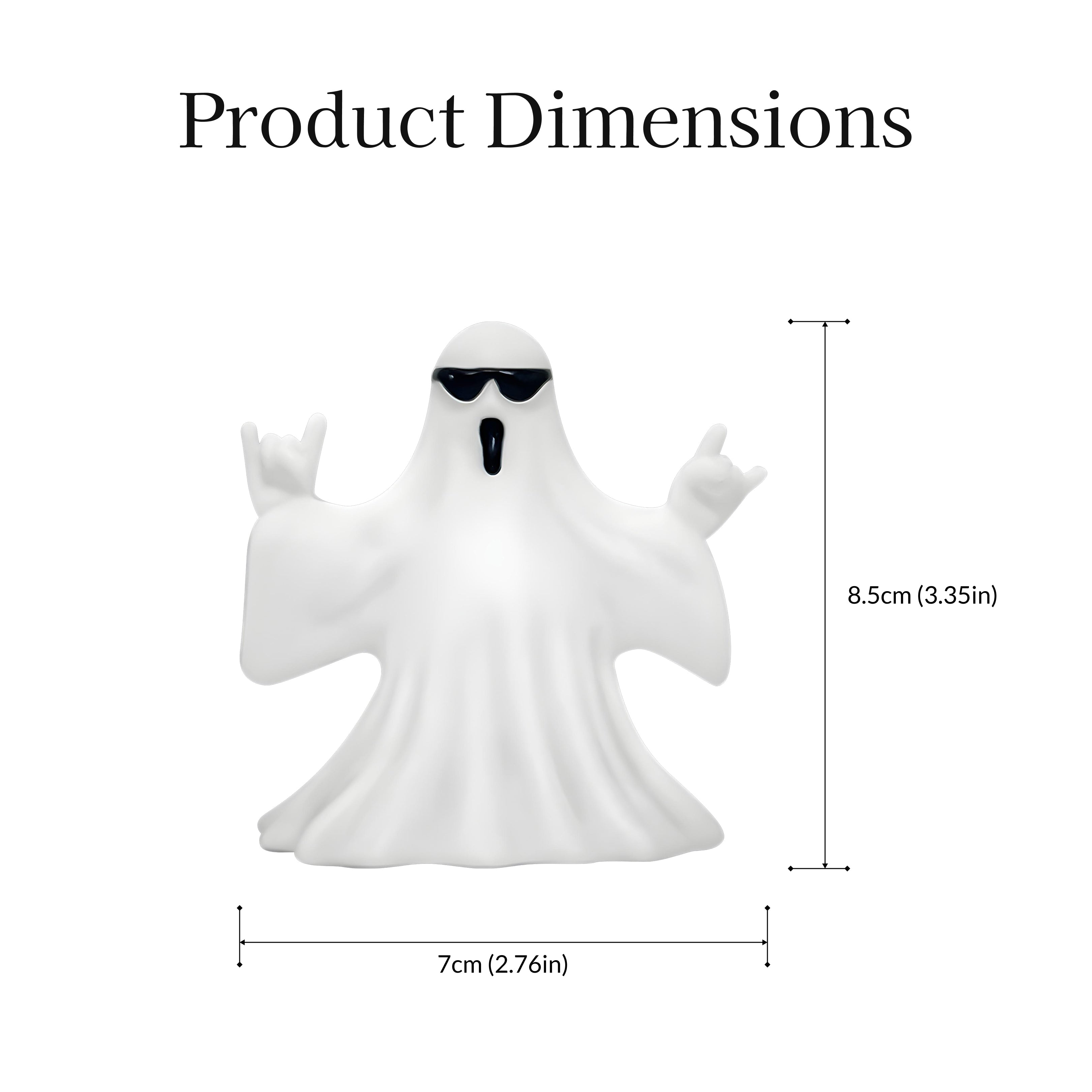Add some cool vibes to your Halloween décor with this ghost figurine rocking dark sunglasses. Its fun, quirky design makes it a great conversation piece at parties or a playful addition to your spooky décor setup. Ideal for shelves, mantels, or Halloween displays.
